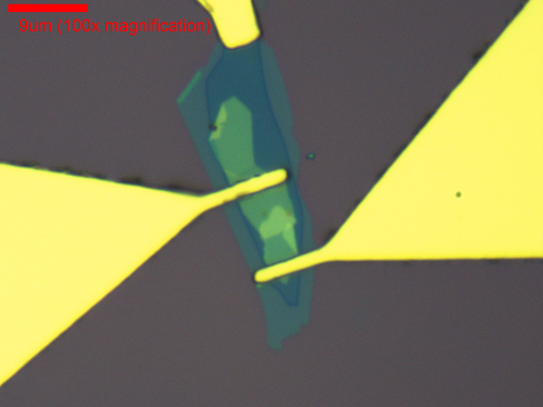 ![]() | A stack of 2D materials used to create a Van der Waals heterojunction. By using a thin piece of graphite as the gate (contact on the top of the image) and hexagonal Boron Nitride, sensitive 2D materials can be protected from charge traps that occur on SiO2 surfaces. Here, two transition metal dichalcogenides are overlapped to form a junction which has unique sensitivity to light. To build these, the flakes need to be picked up and stacked together mechanically. Image and fabrication by Augustin Griswold. Ethan Hogan and Miller Nelson assisted in finding clean flakes via mechanical exfoliation and AFM. |